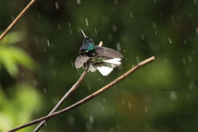 This image are from Trinidad and either just after or during it was raining! The hummingbirds, especially the White necked Jacobins ( like the one above) frolick around in the rain, as if to show off that unlike other birds, hummingbirds are not afraid of catching a cold! They can shrug off all the rain water with a mighty shake and be good as dry in a few seconds ( actually milliseconds!).