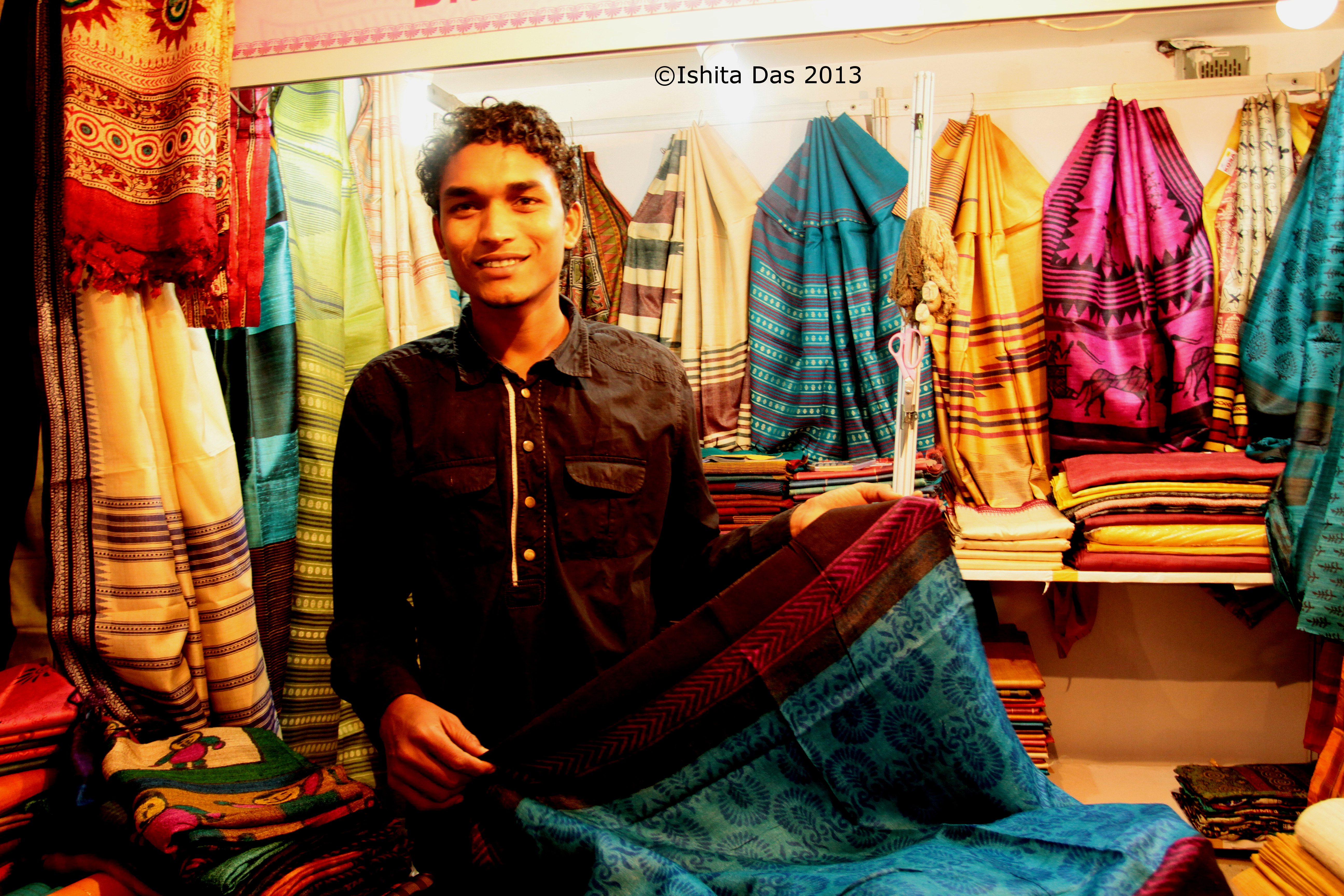 Just that trip would have made this year’s, most unnatural, second trip to India worth it. But it seems, as a pay back to a terrible year in most counts, I was going to get a few more treats. In Delhi, my mom took me to a silk exhibition. Now, there is certainly no dearth of ‘Melas’ is Delhi. Melas or fairs are so common, we have vast grounds just to host the trade fairs, the book fairs and all kinds of other fairs. But this one, was in Bikajikama Place – that is on the road that I took to go to school, for years. Even if I was in a bus most of the time, I went to college taking that route too!!! Yet, I never knew of the stores that sold handloom silk in the place and had never ever heard of the Silk Exhibition. There was silk of every kind, all handloom and often embroidered coming straight from the weavers with as little mediator interference as possible. So, you are not buying the scarf from the one who made it, but he is probably the brother. It was beautiful and I even went again. My one weakness are stoles and scarves and I cannot have enough of them. There were sarees as well. Dupiar, Eddi, Kota, Mutka, Chanderi and even Khadi silks ( and many others I don’t know) from various parts of India, Bhagalpur, Kashmir, West Bengal, Assam, Madhya Pradesh to name a few. There were patterns that may look like prints, but are actually hand woven.