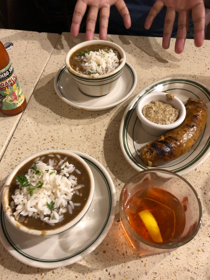 While there is a lot to think about Covid19 it self and write, both of which I am doing or have done, I won’t be writing much about it in this post. Today it’s time to rue the time we were in New Orleans and going around the oldest restaurant streets, in a food tour. I have been cooking for many years now (but I don’t want to count),I am enough of an existentialist to be a gourmet cook. And I had never heard of Roux until September 2019. So, that means unlike researching every thing about modeling, vaccines, treatments, policies that are needed to combat Sars-CoV2, I don’t even know where to look for food knowledge, even if my foodie friends have tried to direct me to TV shows, but I have not been compelled. It is much nicer to go to a place they make food a divinity. NOLA is certainly one of those places. Roux is a french sauce that can be the base of any type of seafood, meat stew. It is basically equal parts oil (plain/white) and flour and constant stirring, because if one doesn’t, it will burn. People make large pots of it and store. Our cooking demonstrator had a way of measuring how long it takes: the number of wine glasses she has had. The lighter (white or blond) roux is for seafood chowders, soups and darker for meat gumbos. The darker one takes her 3-5 wine glasses.