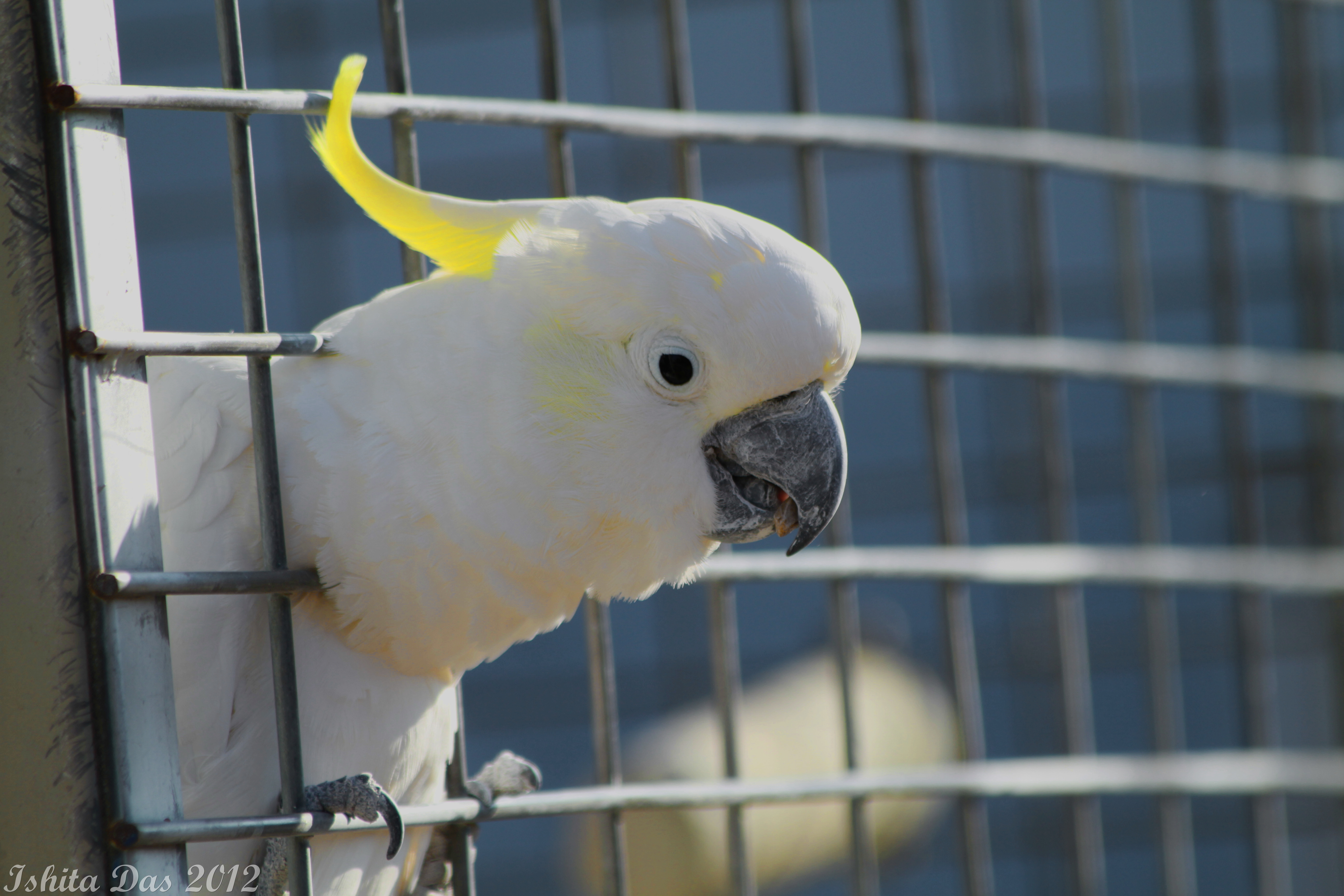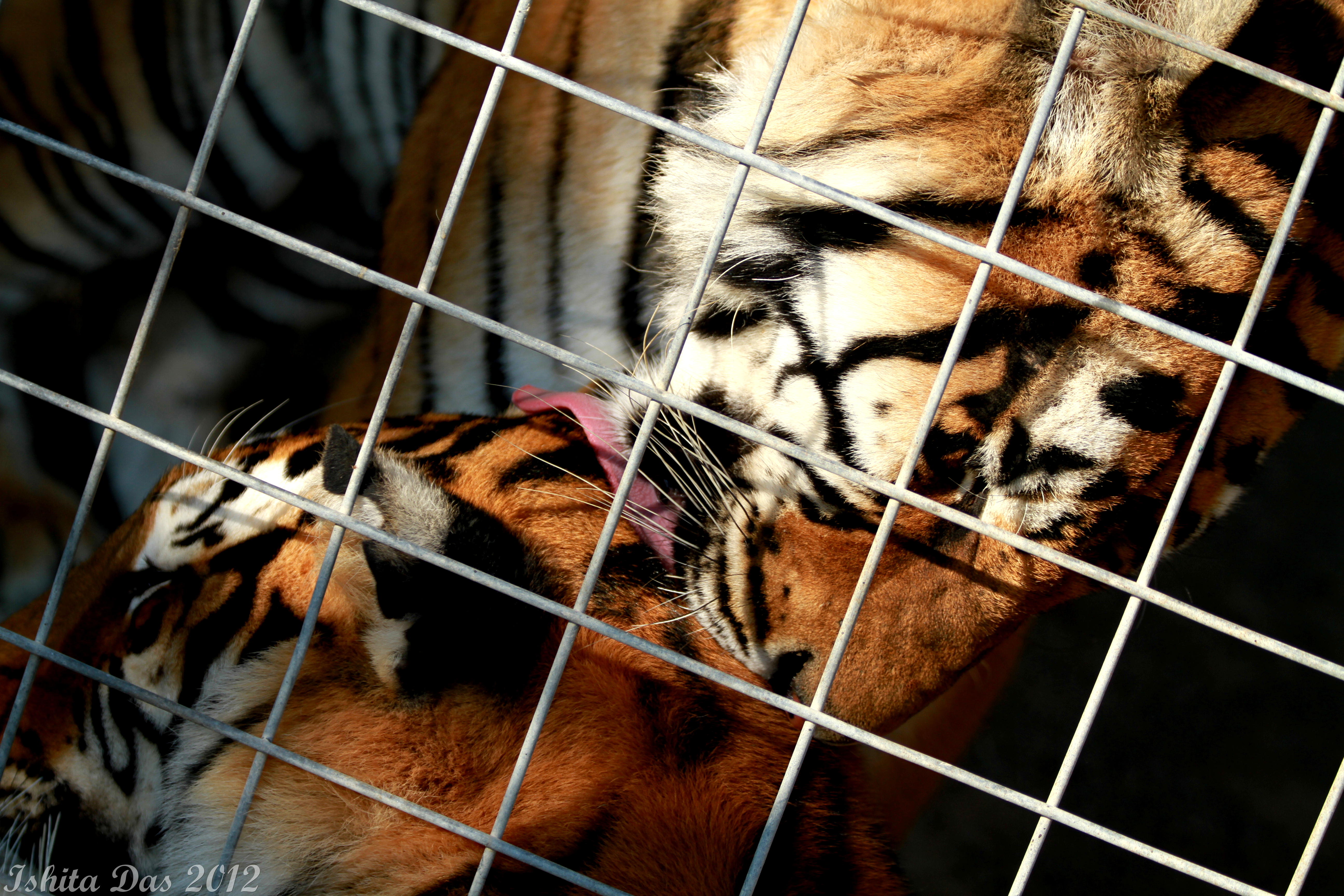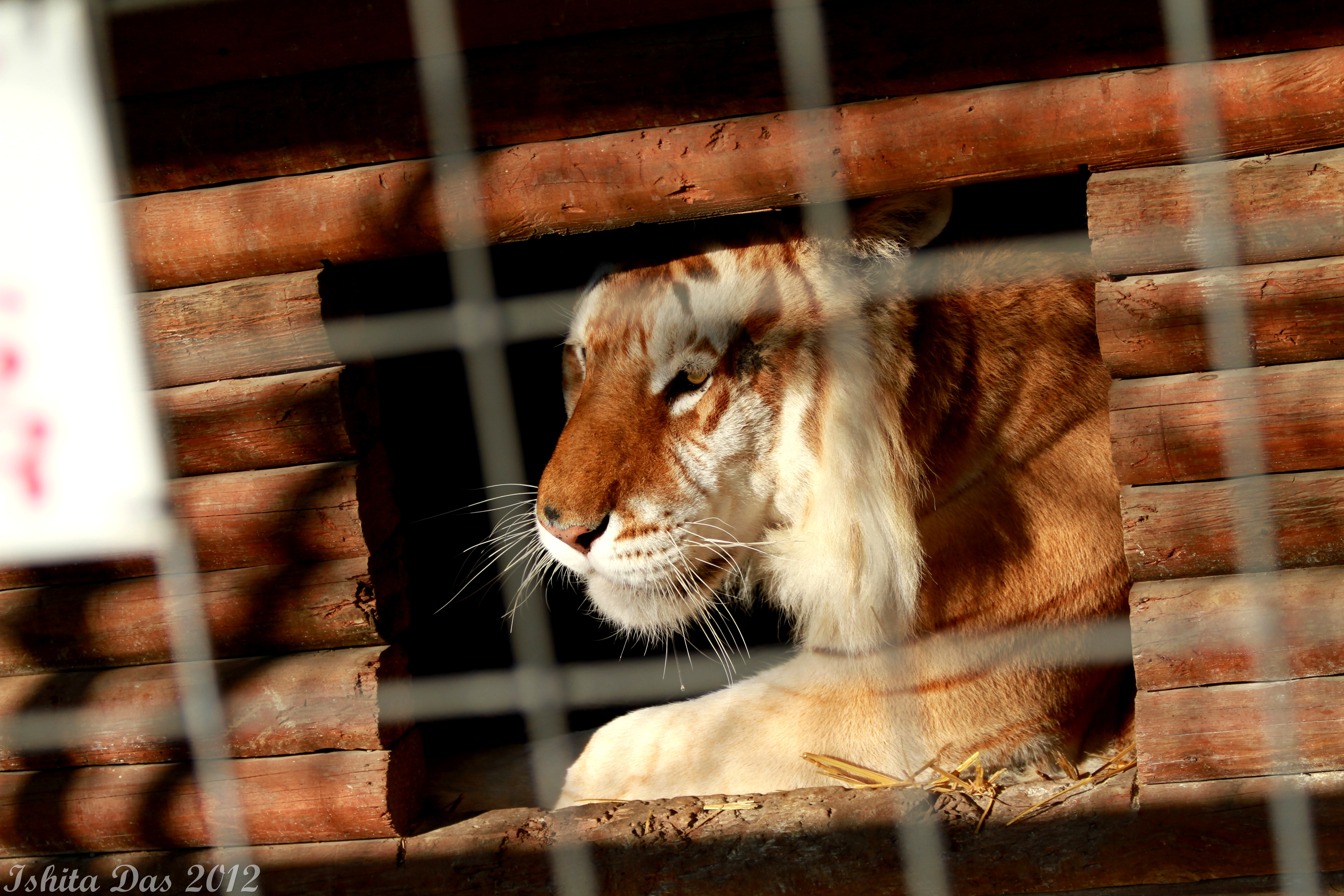 In the photos, the Grizzly was newly acquired by the park, was very frustrated at being bound. Not surprisingly. The two tigers were in a cage barely big enough for them but shared a moment of togetherness. The cuckatoo, was clearly previously owned by people, trained to speak and stuck its head out to talk to us, saying “Hi there, hello!!’ and following us till the very limit of its cage. The strawberry tiger( a recessive trait) is one of only about 33 in the world and I don’t know if he is still alive.